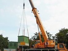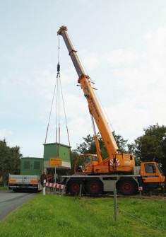 Ein 50-Tonnen-Kran war nötig, um die nächsten Bestandteile des Fernwärmenetzes der Energiegenossenschaft Föhr an Ort und Stelle zu hieven. Nun stehen Kesselcontainer, Nebenaggregate und Transformatoren auf ihren vorbereiteten Fundamenten in Oldsum und können planmäßig in das Netz eingebunden werden. Aus Schallschutzgründen muss der gasbetriebene Verbrennungsmotor allerdings in einem massiven Gebäude untergebracht werden, damit die Lärmemissionen so gering wie möglich bleiben.