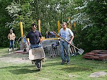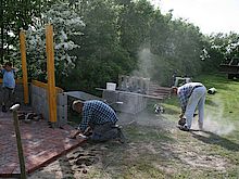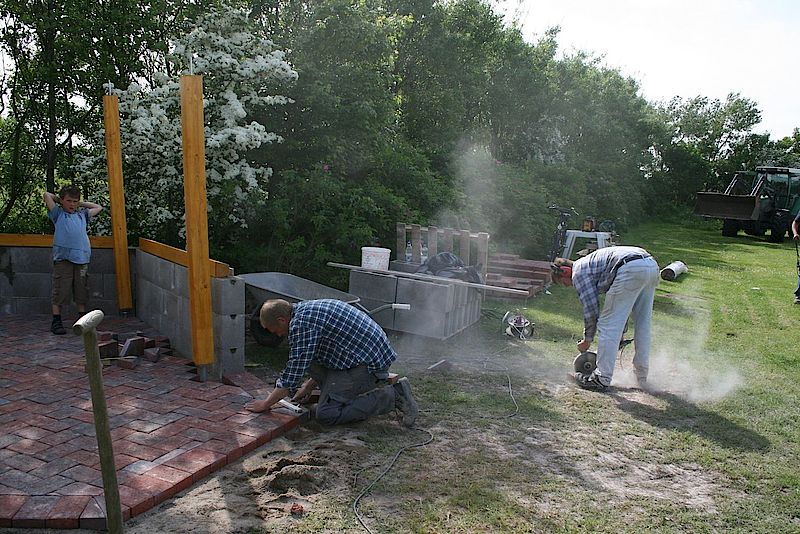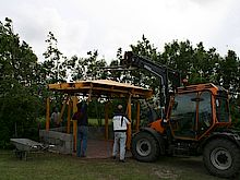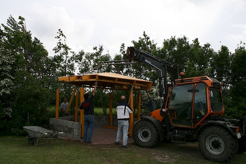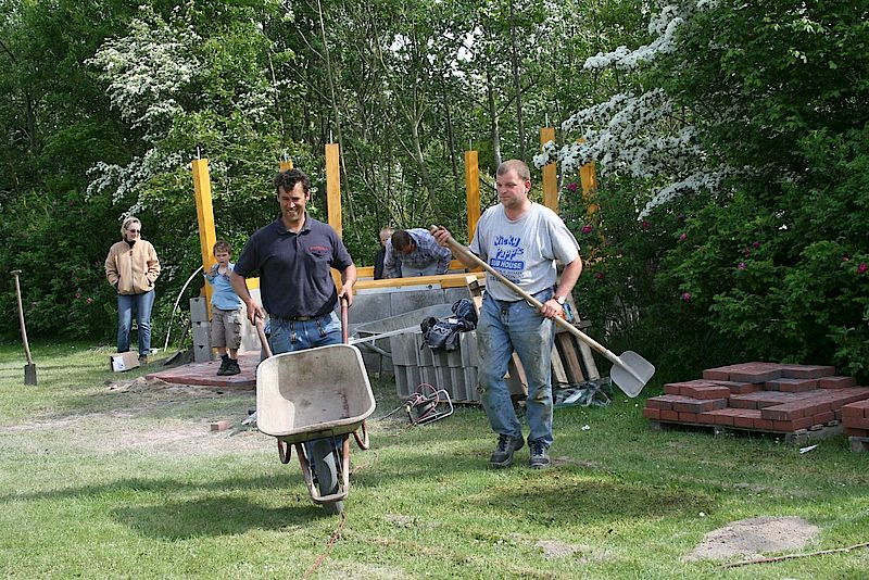 Die Verschönerung unseres Spielplatzes stand am 22.05.09 auf dem Programm. Freiwillige Helfer aus der Gemeinde haben einen Holzpavillon für unseren Spielplatz aufgestellt. Nun mit Rasendach und Büschen umrandet haben wir nun einen schönen "Picknickplatz" auf dem Spielplatz. Zeitgleich bekam das Gerätehaus eine Terrassentür und eine Terrasse.